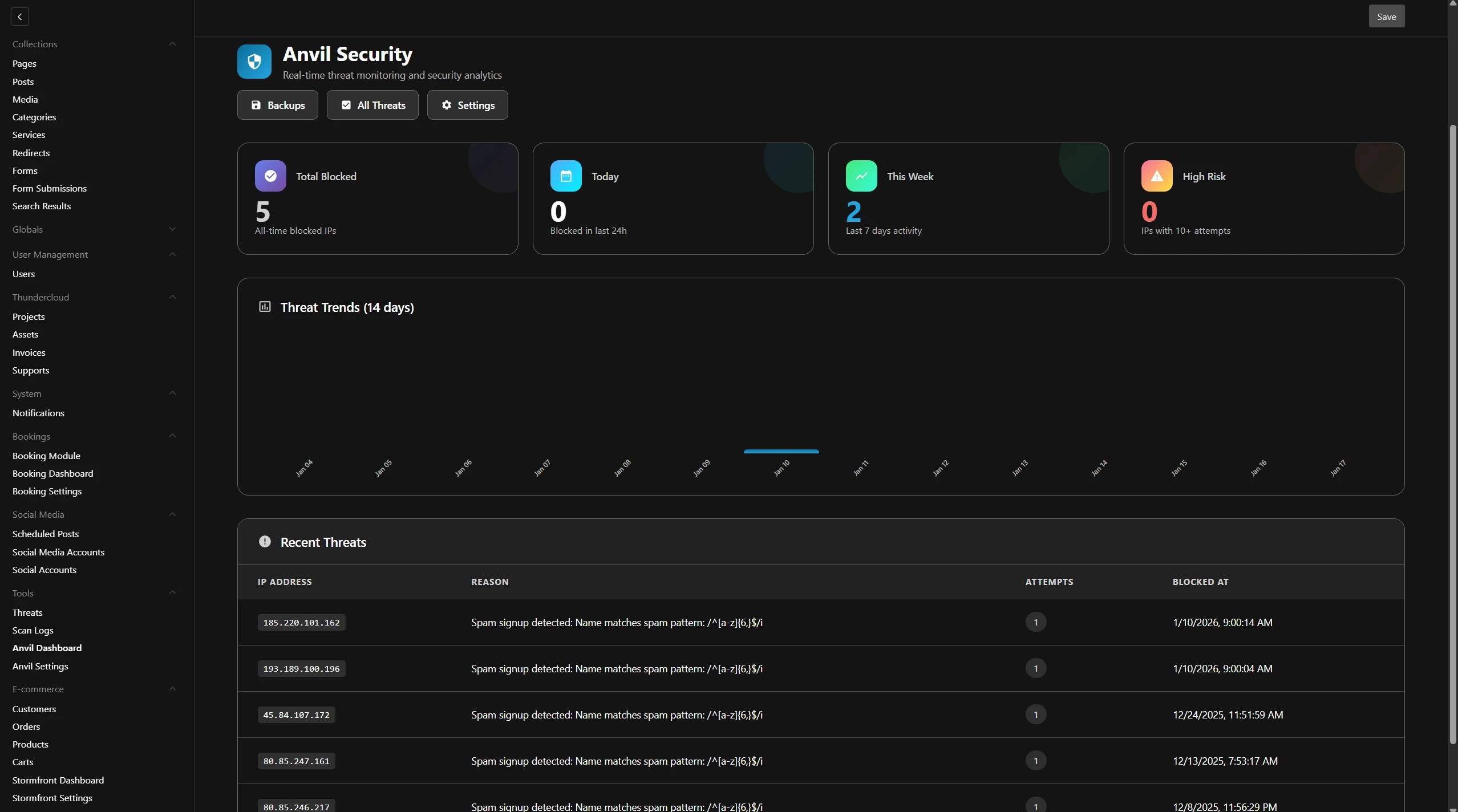 Anvil adds an essential security layer to ThunderBolt CMS. With automated file scanning, IP blacklist management, and comprehensive audit logging, Anvil helps protect your site from malicious uploads and suspicious activity. Automated S3 backups ensure your content is safe and recoverable.